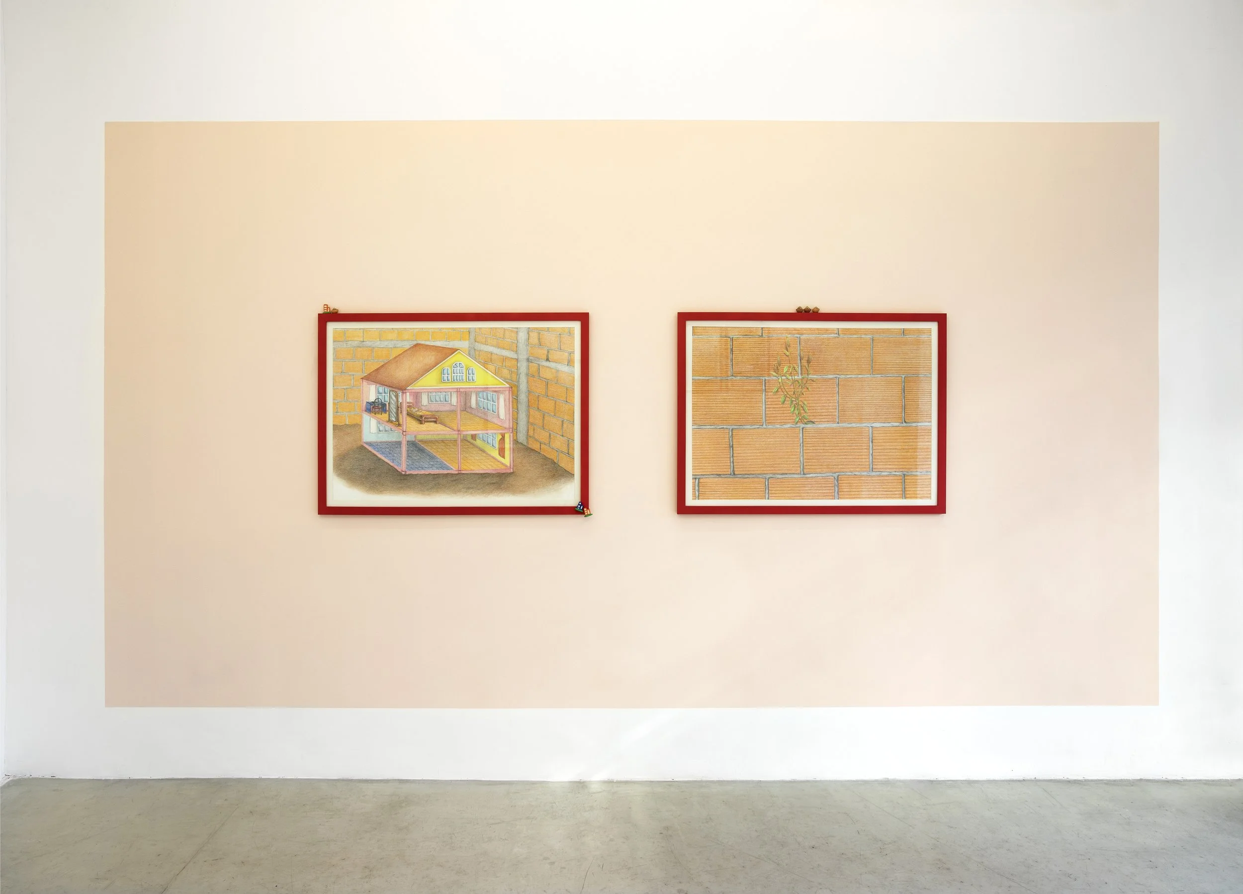 The dollhouse—a fundamental object that connects fantasy with the act of building, designed to operate stereotypes and guide desires from childhood—emerges with anti-melancholic force to express the search for a unique spatiality. Made of shiny pink plastic, it takes center stage on the dirt floor of her childhood home, encapsulating not a domesticated aspiration, but a disruptive desire. Its reproduction on paper is an affective response to the world, an inversion of the codes of conformity that exposes the historical trajectories of negotiation in the face of material obstacles and the distribution of the sensible.